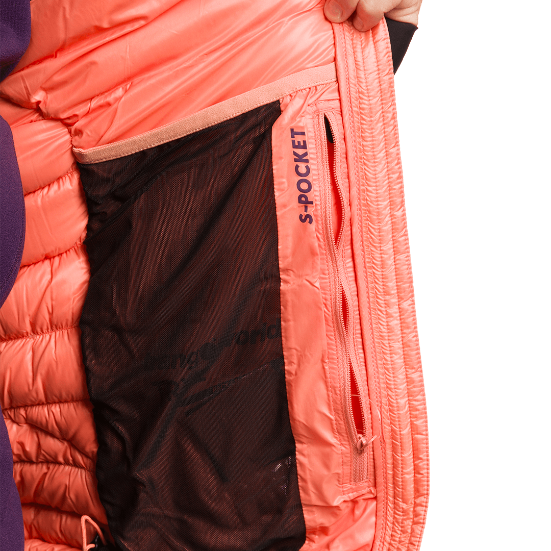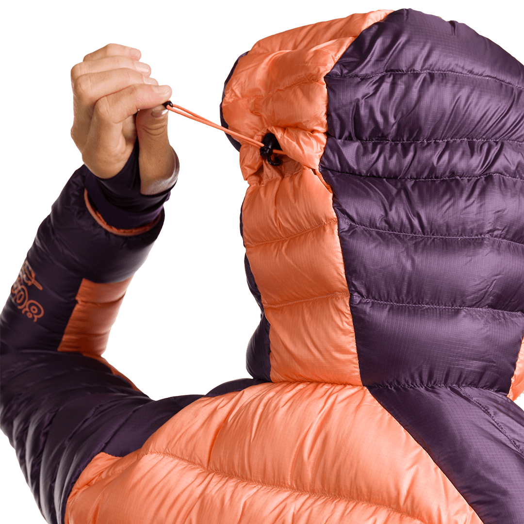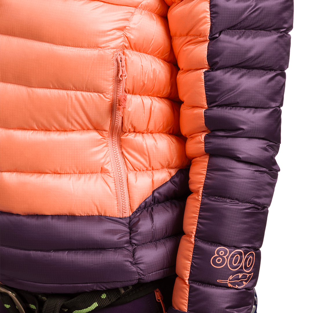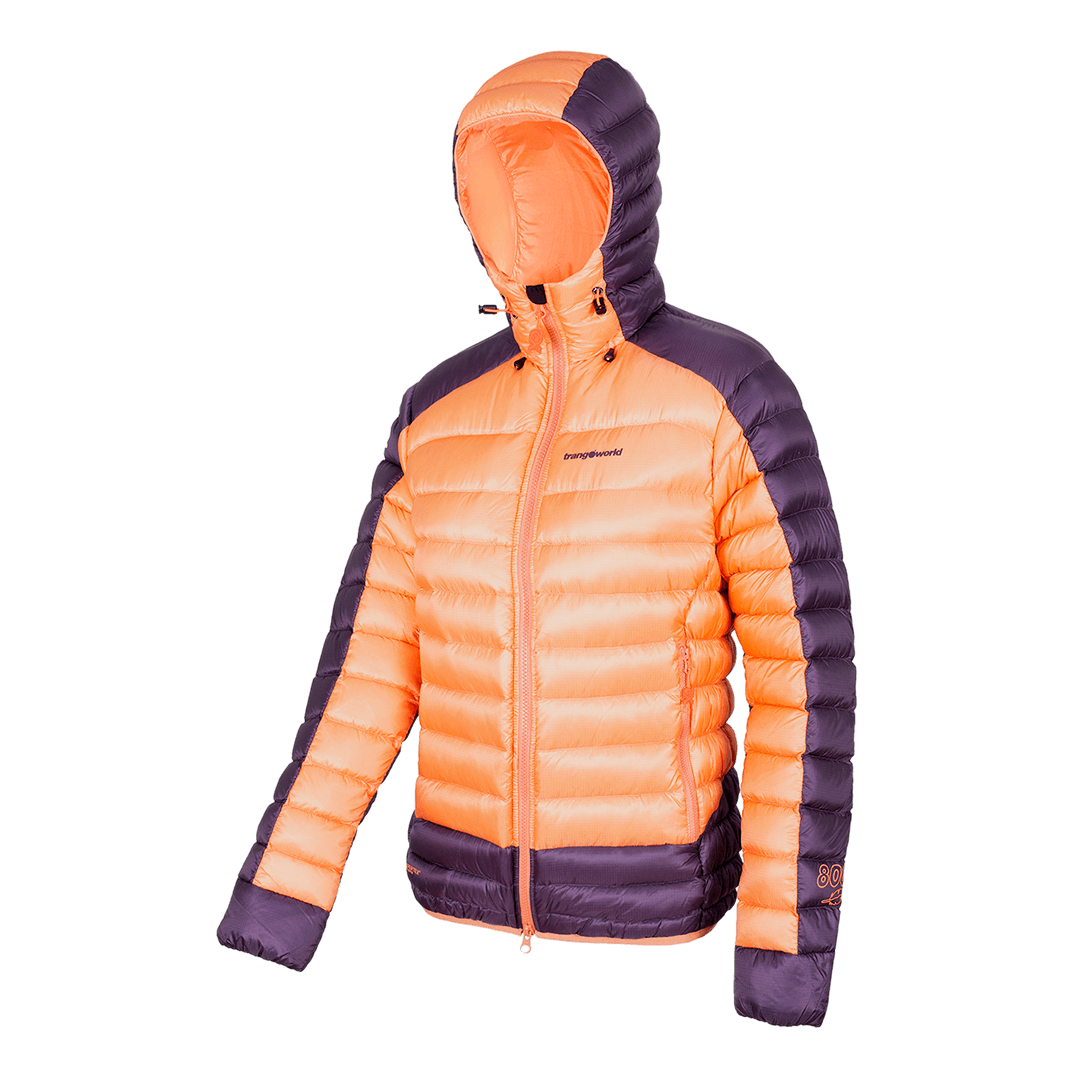 La chaqueta está fabricada con Pertex® Quantum y rellena con pluma RDS Eu Goose Down 100/0 800 cuins (180 g) para ofrecer calidez extrema y ligereza. Incluye capucha fija con doble ceñidor facial, manga sentada, puños ajustados con elástico y ceñidor elástico en el bajo con cierre tanca. La parte trasera más larga y el panel lateral adaptable mejoran el ajuste. Dispone de bolsillos ventrales con cremallera y tres bolsillos interiores, uno con cremallera, para un almacenamiento seguro.