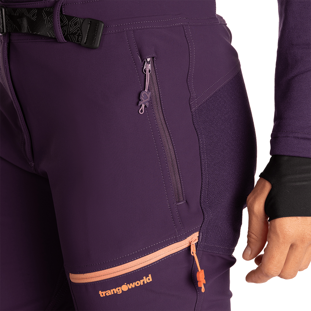 Tiene cintura con cinturón y goma interior ajustable, cremalleras en los bajos y rodillas conformadas con refuerzos en las áreas de mayor desgaste. El diseño ergonómico y ajustado está optimizado para alpinismo, con bolsillos con cremallera para mayor seguridad y practicidad. Además, cuenta con un tratamiento repelente al agua libre de PFC, tejido bielástico para máxima movilidad y secado rápido, ofreciendo protección y funcionalidad para actividades de montaña.